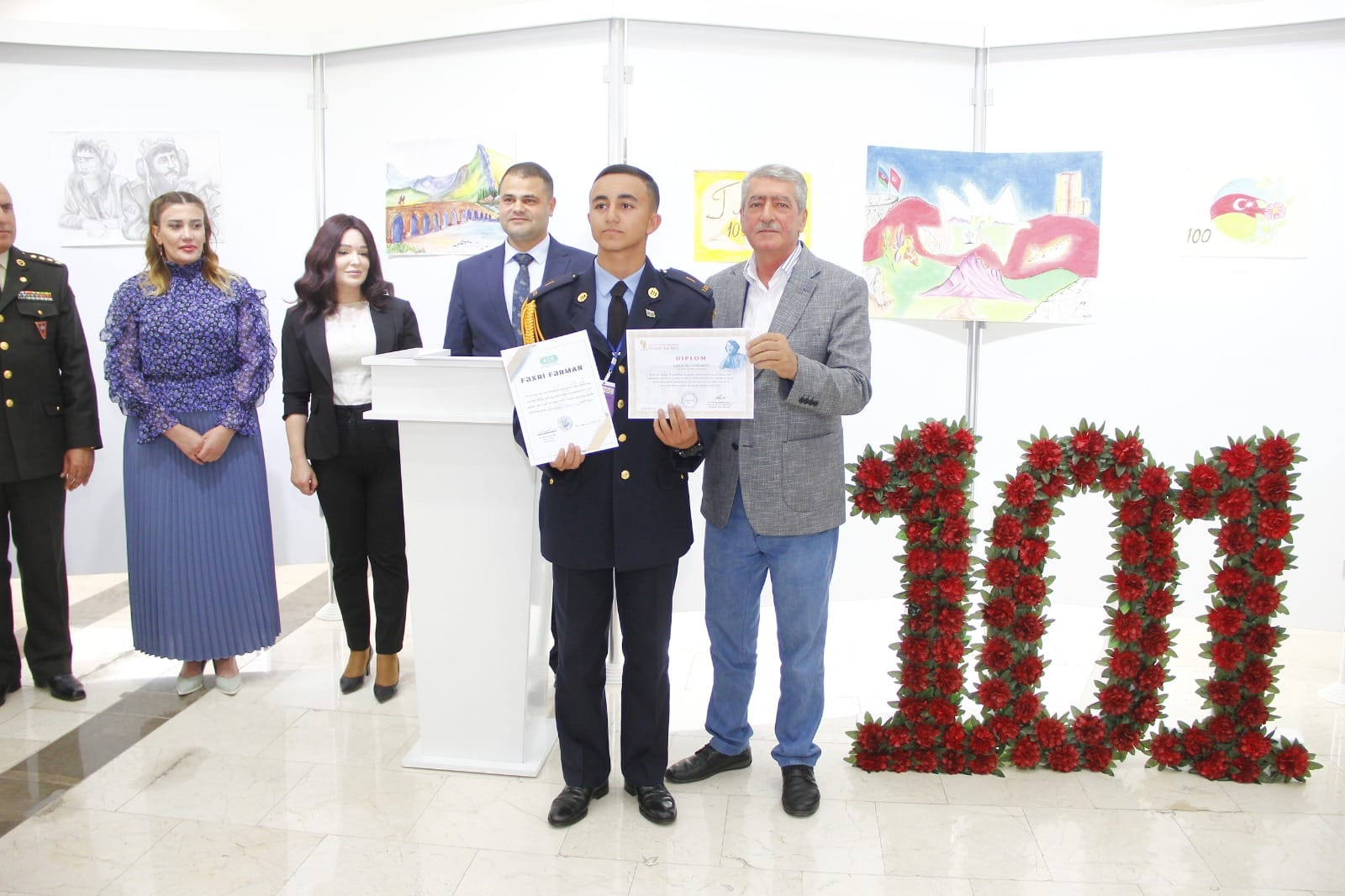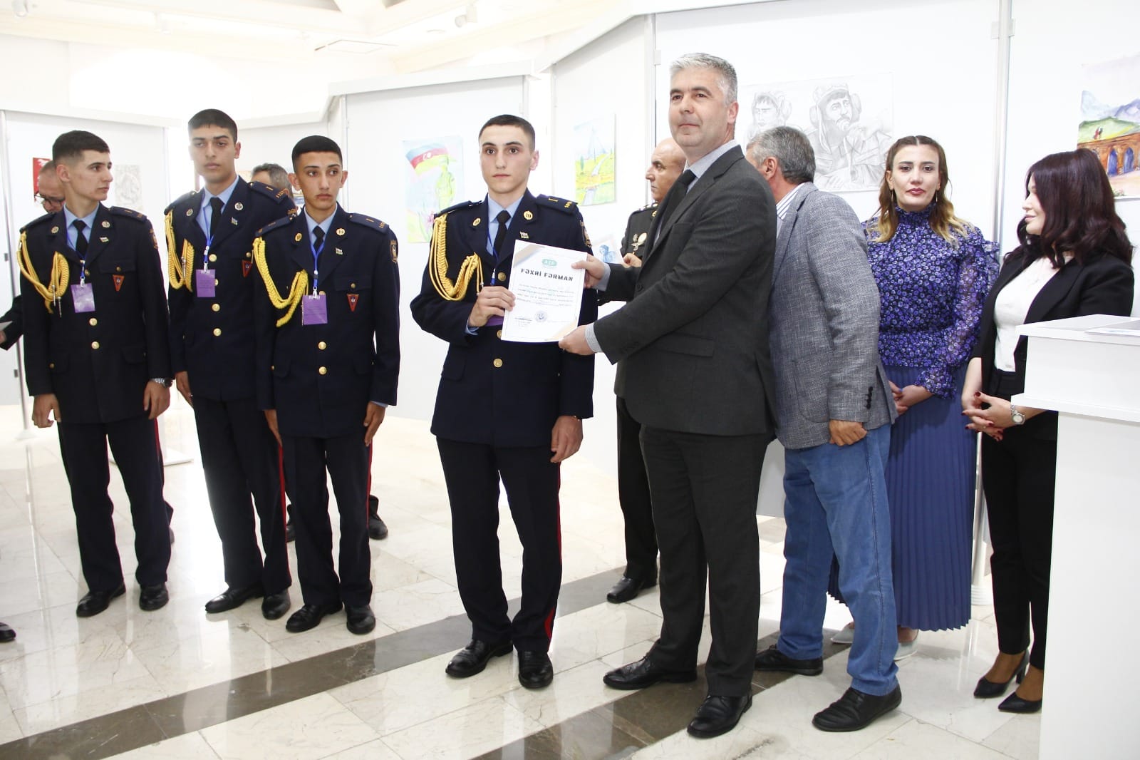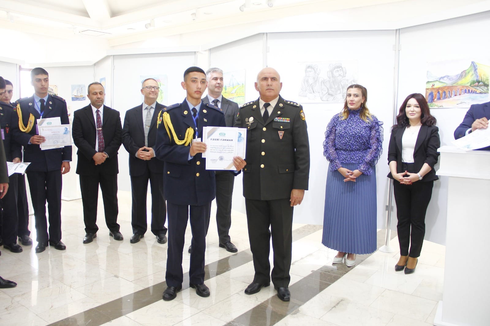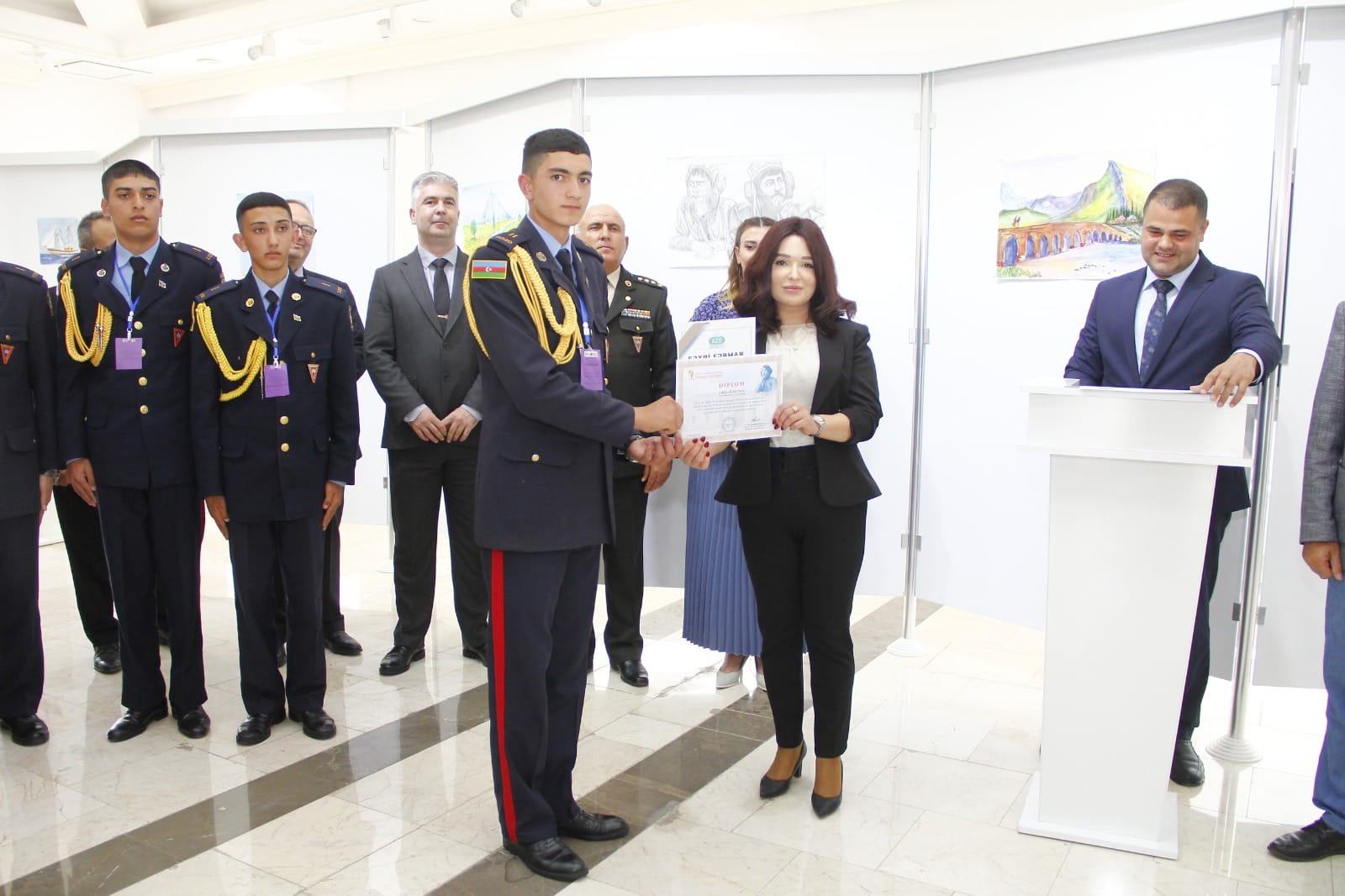 Naxçıvan Muxtar Respublikası Rəssamlar Birliyinin Bəhruz Kəngərli adına Sərgi Salonunda Ulu Öndər Heydər Əliyevin xatirəsinə həsr olunmuş Heydər Əliyev adına Hərbi Lisey kursantlarının 101 ədəd rəsm və əl işlərindən ibarət sərgi təşkil olunub. Tədbirdə ilk olaraq Ümummilli Lider Heydər Əliyevin və şəhidlərimizin əziz xatirəsi bir dəqiqəlik sükutla yad edilib. Giriş sözü ilə tədbiri açıq elan edən Naxçıvan Müəllimlər İnstitutunun dosenti, sənətşünas Nizami Alıyev bildirib ki, sərgilənən işlər içərisində həm qrafika, həm də rəngkarlıq əsərləri, eləcə də texniki yaradıcılıq işləri yer tutur. Müxtəlif mövzularda nümayiş olunan işlər arasında vətənpərvərlik mövzusunun üstünlük təşkil etməsi isə bizi daha çox sevindirdi. Biz bu gün buna daha da şahid olduq ki, kursantlarımız hərbi sirlərlə yanaşı, onlara yaradılan müxtəlif şəraitlərdən istifadə edərək yaradıcılığa da vaxt ayırırlar. Tədbirdə Heydər Əliyev adına Hərbi Liseyin rəisi Elşad Həsənov çıxış edərək təşkil olunan sərginin kollektivləri üçün sevincli bir hal olmasını vurğulayıb. Hərbi liseyin kollektivi olaraq kursantların vətənpərvərlik ruhunda tərbiyə olunması cəmiyyətimizə, dövlətimizə sağlam və Vətənini sevən gənclərin yetişdirilməsi kimi vacib tapşırığın yerinə yetirilməsi bizi qürurlandırır. Biz bu sərgi ilə həm də onu demək istəyirik ki, təhsilimizin nəticələri, digər göstəricilərimiz artıq bunu sübuta yetirir. Fərəh hissi keçiririk ki, bu gün kursantların düşüncə və bacarıqlarını geniş kütləyə təqdim edirik. Naxçıvan Muxtar Respublikası Gənclər və İdman Nazirliyinin Aparat rəhbəri İlhamə Nəzərova tədbirdə çıxış edərək bildirib ki, bu gün Azərbaycanın zabiti olmaq və bu ölkənin hərbi sistemində onun ərazi bütövlüyünü, onun suverenliyini qorumaq üçün inamla irəliləyən hər bir gənc ölkəmizin gənclər siyasətinin ən bariz və uğurlu örnəyidilər. Naxçıvan Şəhər Gənclər və İdman İdarəsinin rəisi Tahir Məmmədli bildirib ki, Ümummilli Lider Heydər Əliyevin adını daşıyan hərbi liseyin kursantları nəinki rəsm əsərləri ilə, digər sahələrdə də öndə gedirlər. Onlar mütəmadi olaraq müxtəlif yarışlara qatılıb mükafatlara layiq görülürlər.